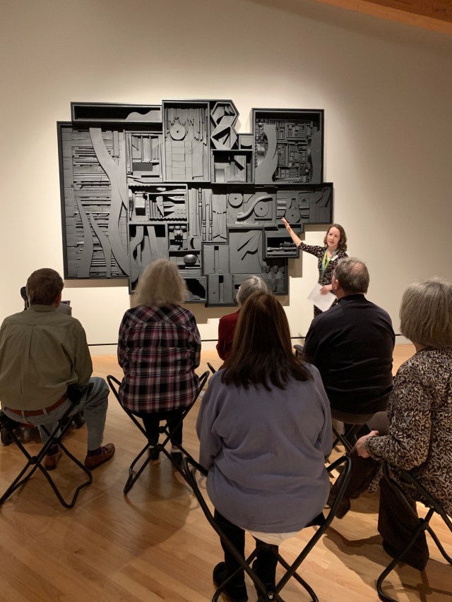 The theme of this week’s class was shapes and shadows, so the program attendees walked and wheeled into the Crystal Bridges gallery to study Night Zag Wall, a 108-square-foot display of arranged and painted wood by Louise Nevelson.